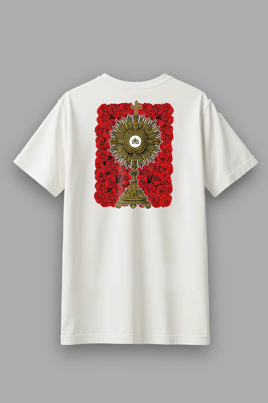 Essa frase na parte frontal da peça já revela sua essência: o Amor que sangra é o mesmo que floresce. A cruz que fere é a mesma que cura. A estampa das costas, com o ostensório em meio a rosas, traduz visualmente esse mistério a dor redentora que se transforma em beleza diante do altar.