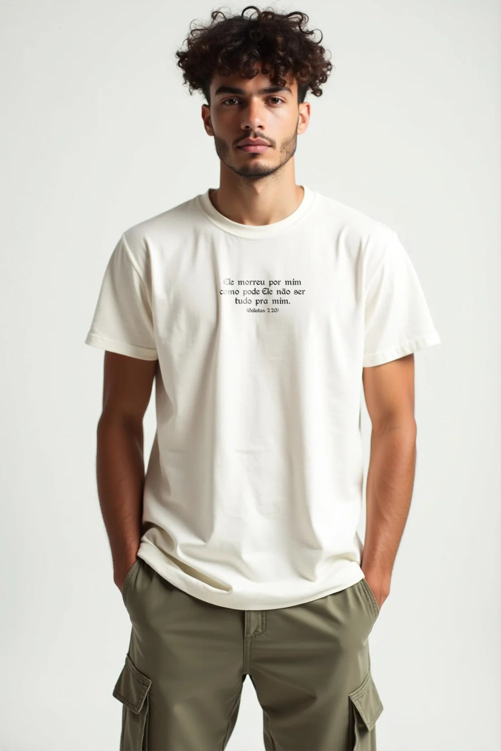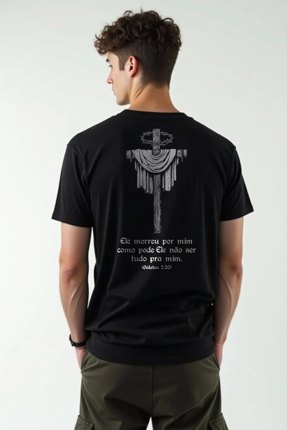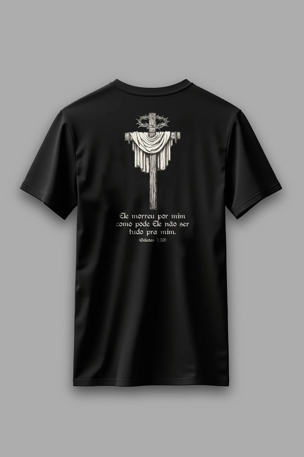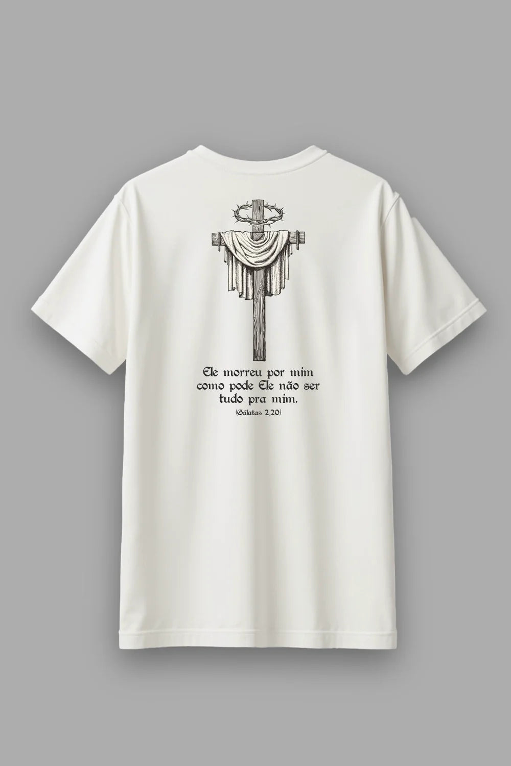 A cruz vazia, o pano dobrado e a coroa de espinhos falam de um amor que foi até o fim. Amor que se entregou, que morreu, que venceu. A estampa carrega o eco de uma pergunta que precisa ser feita todos os dias: se Ele deu tudo, o que ainda estou retendo?