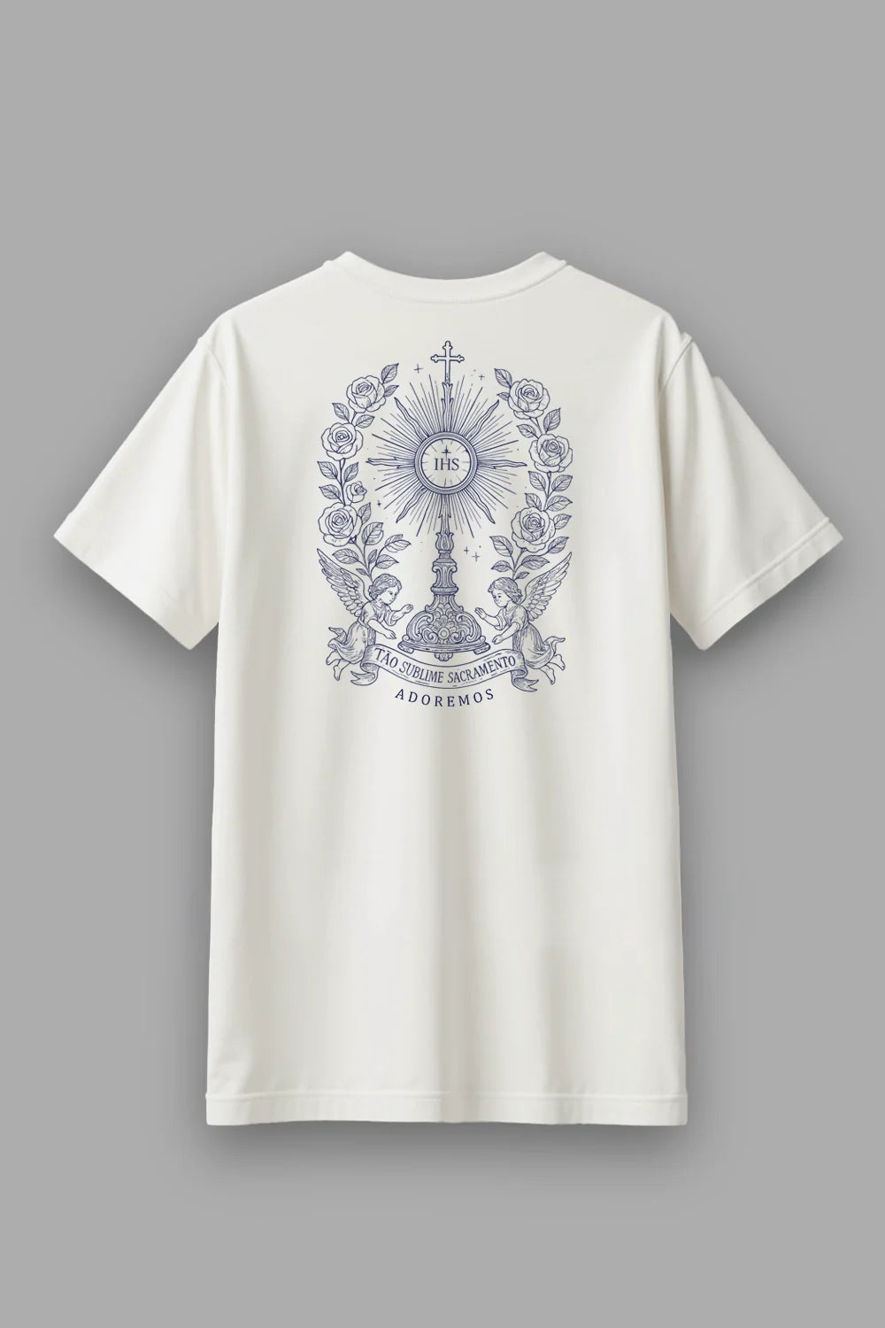 A Camisa Santo Sacramento é um convite silencioso à adoração. Inspirada na beleza da Eucaristia, ela carrega nas costas um desenho detalhado de um ostensório rodeado por ramos de rosas símbolo da oferta de amor e sacrifício que Jesus nos fez no altar da cruz.