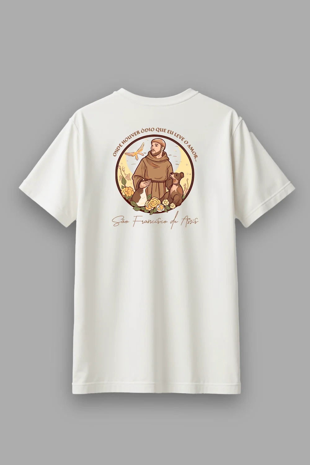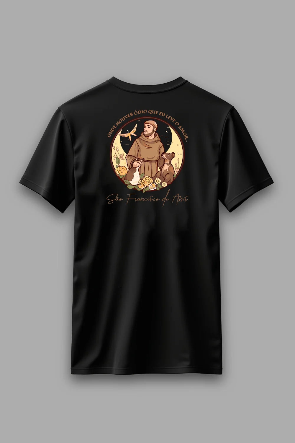 Essa camiseta carrega o espírito de São Francisco de Assis o santo que encontrou alegria na simplicidade e a presença de Deus em toda a criação.